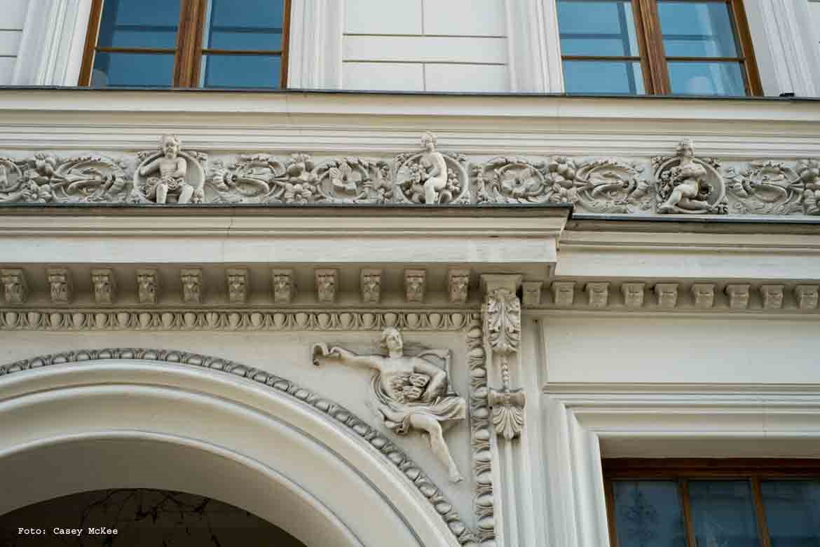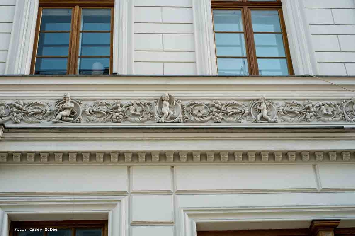 Straßenfassade Detail figürliches Flies nach der Sanierung