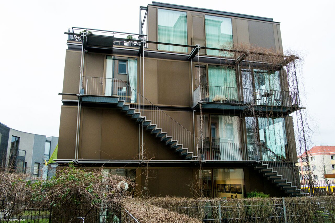 Erstes Townhaus, rechts von der Strelitzer Straße aus gesehen.
