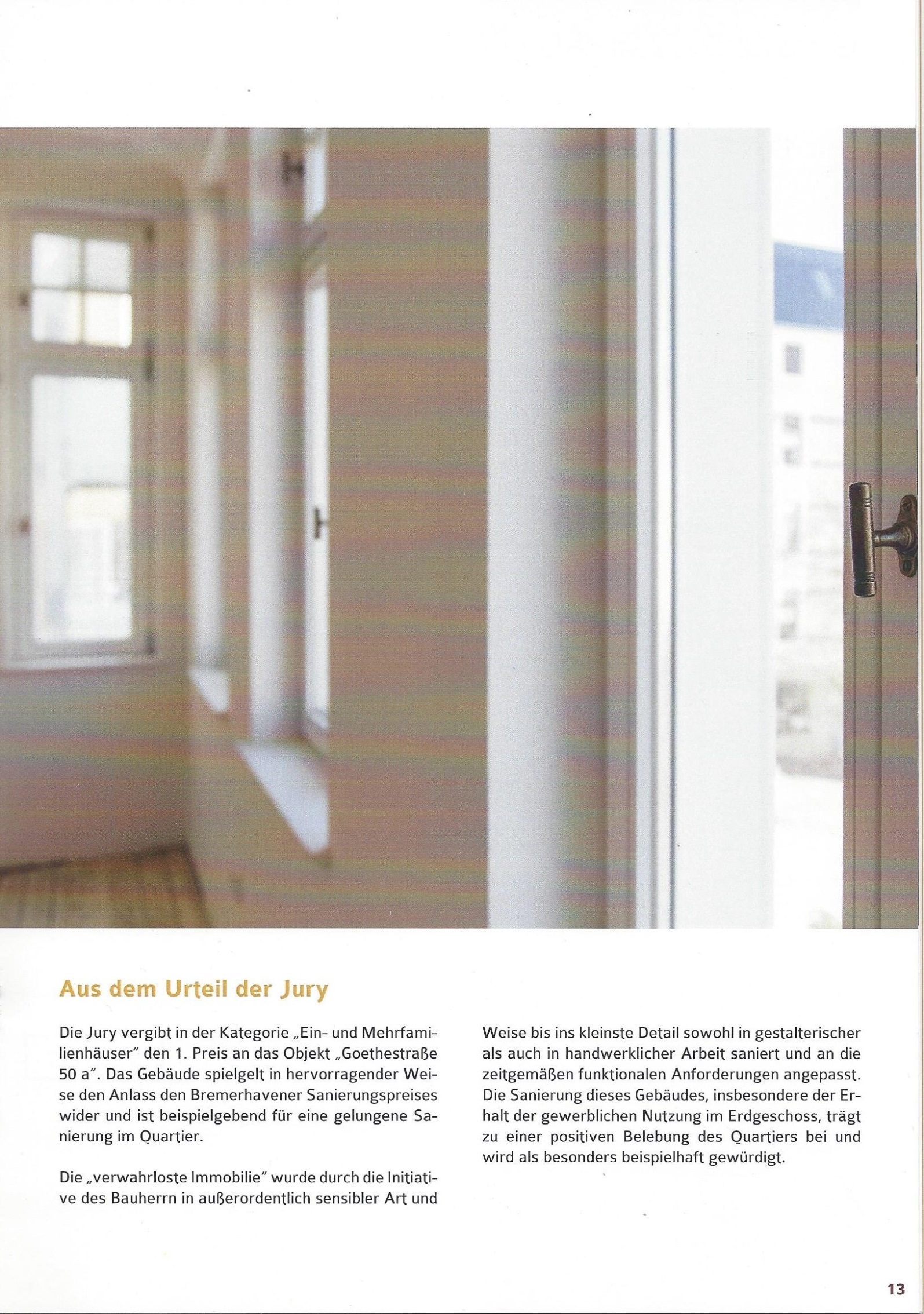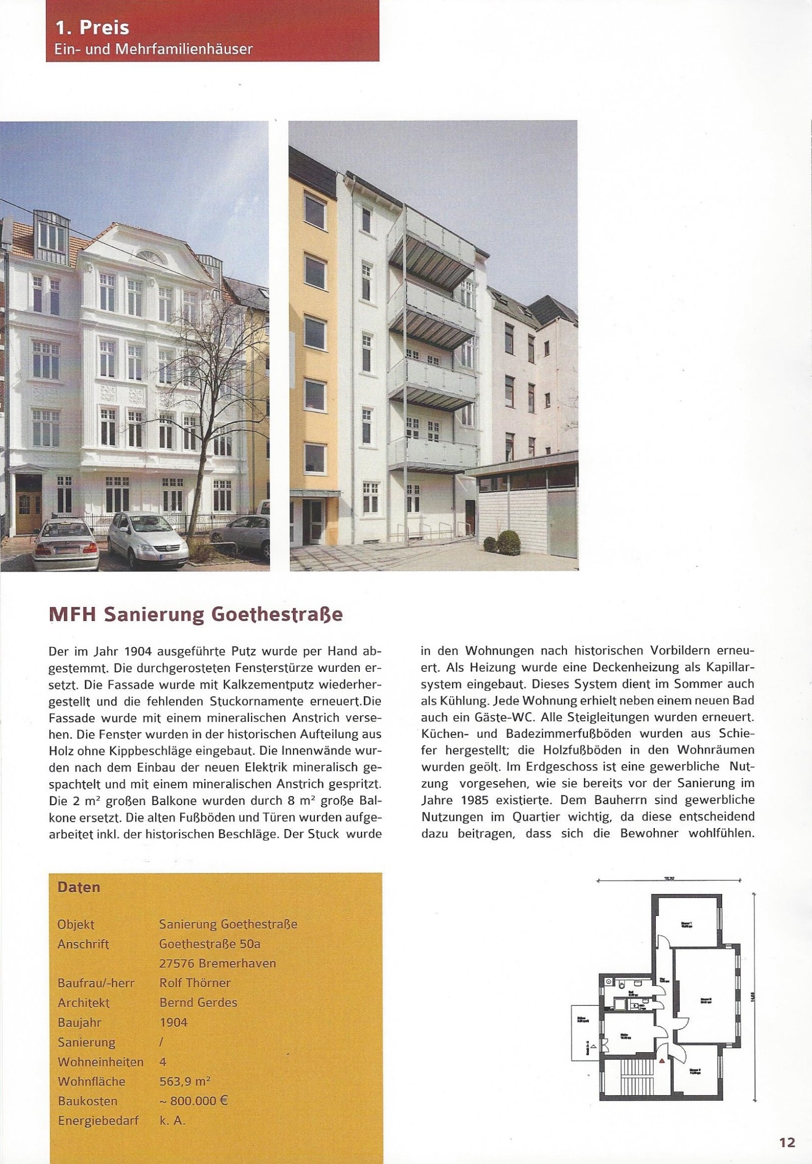 Die Sanierung der Goethestraße 50 A wurde 2018 für eine in allen Bereichen vorbildliche Sanierung mit den ersten Preis beim „Bremerhavener Sanierungswettbewerb für die Sanierung der Altbauten“ ausgezeichnet (vgl. die Ausführungen zum Sanierungspreis auf der nächsten Seite).