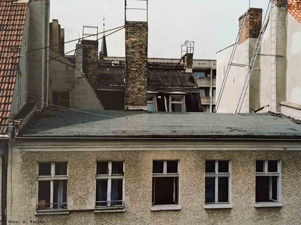 zurück | Straßenseite Fassade nach der Sanierung | Straßenfassade vom gegenüberliegenden Fenster fotografiert. Vor der Sanierung und Wiederherstellung, des im Krieg abgebrannten Daches | weiter |