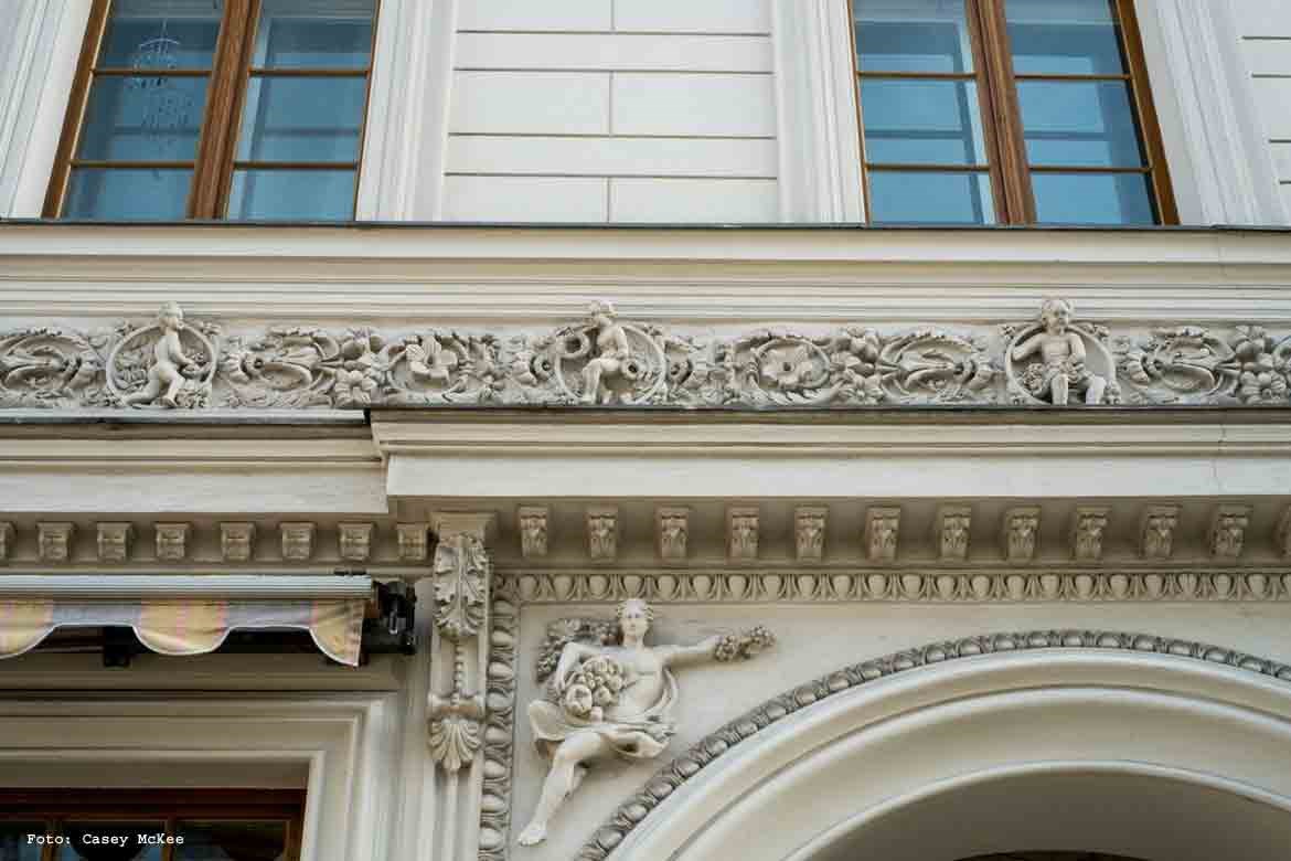 Straßenfassade Detail figürliches Flies nach der Sanierung